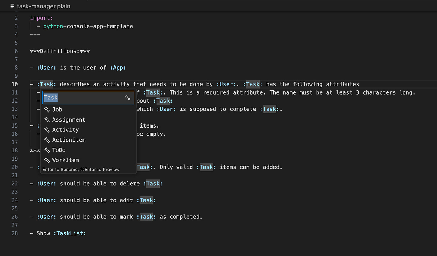 - App is a Python console application.But now imagine a longer specification containing dozens of words whose meanings materially affect the resulting software. How would a developer — or an automated tool — know which words have already been explicitly defined and which still carry implicit, potentially ambiguous meaning?